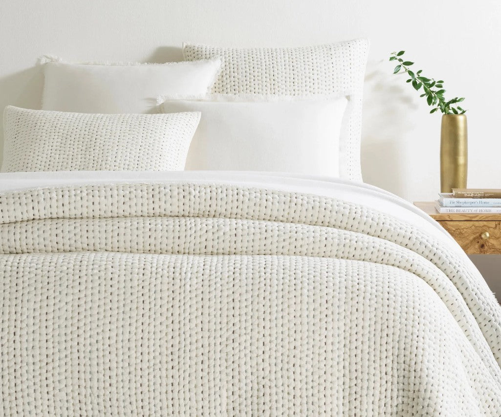 Feel yourself drift away under this gauzy, cloudlike dream. A simple quilt gets a subtle update with hand-crafted Kantha stitched channels in polychromatic earth tones. The precise stitches add structure and support to the buttery-soft cotton voile, blending the antiqued off-white fabric with cushy batting to deliver year-round warmth and transcendent snuggliness. Designed for us by Marie Flanigan, principal of Marie Flanigan Interiors, reflecting her signature style of timeless elegance and innovative simplicity.