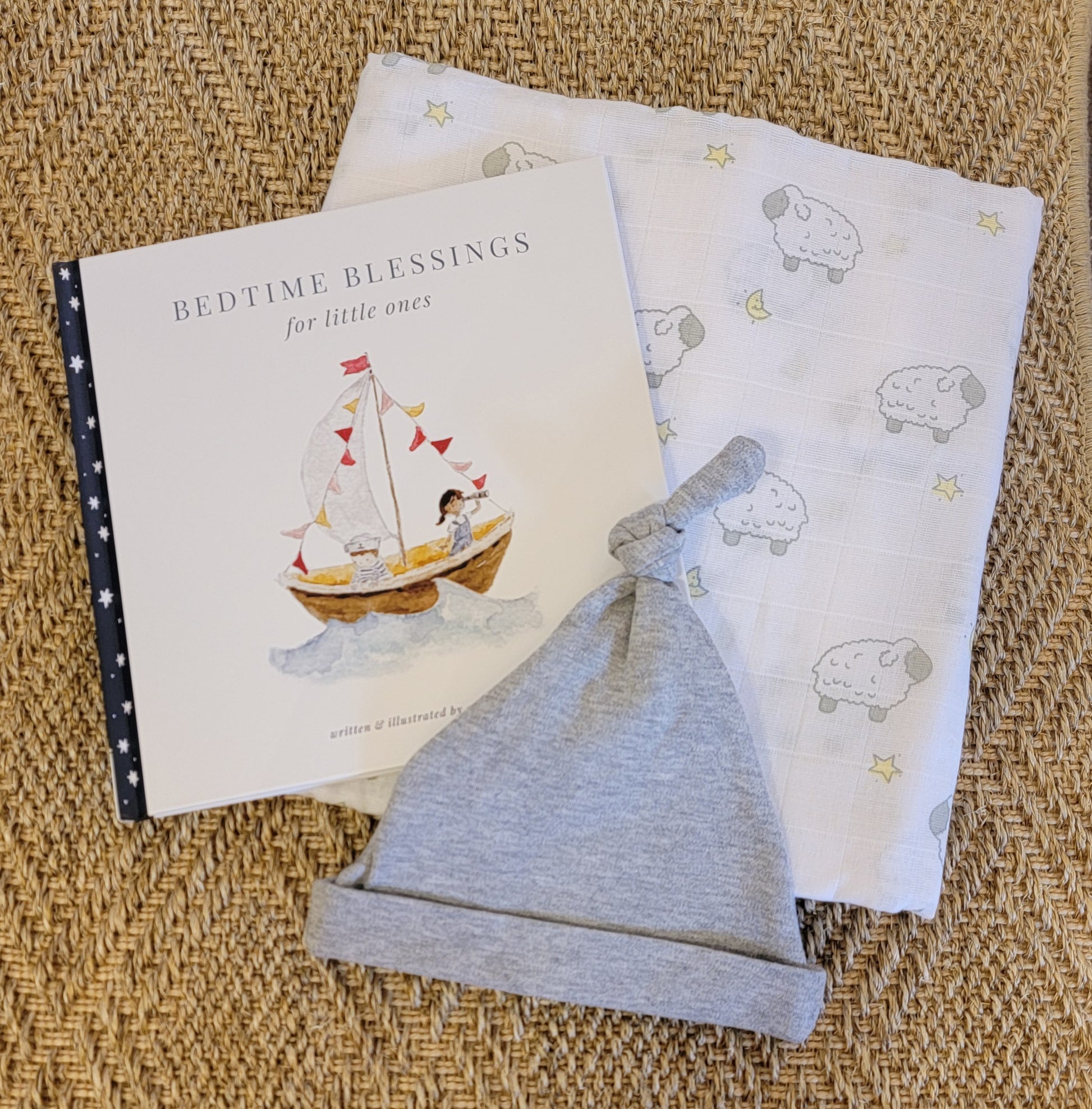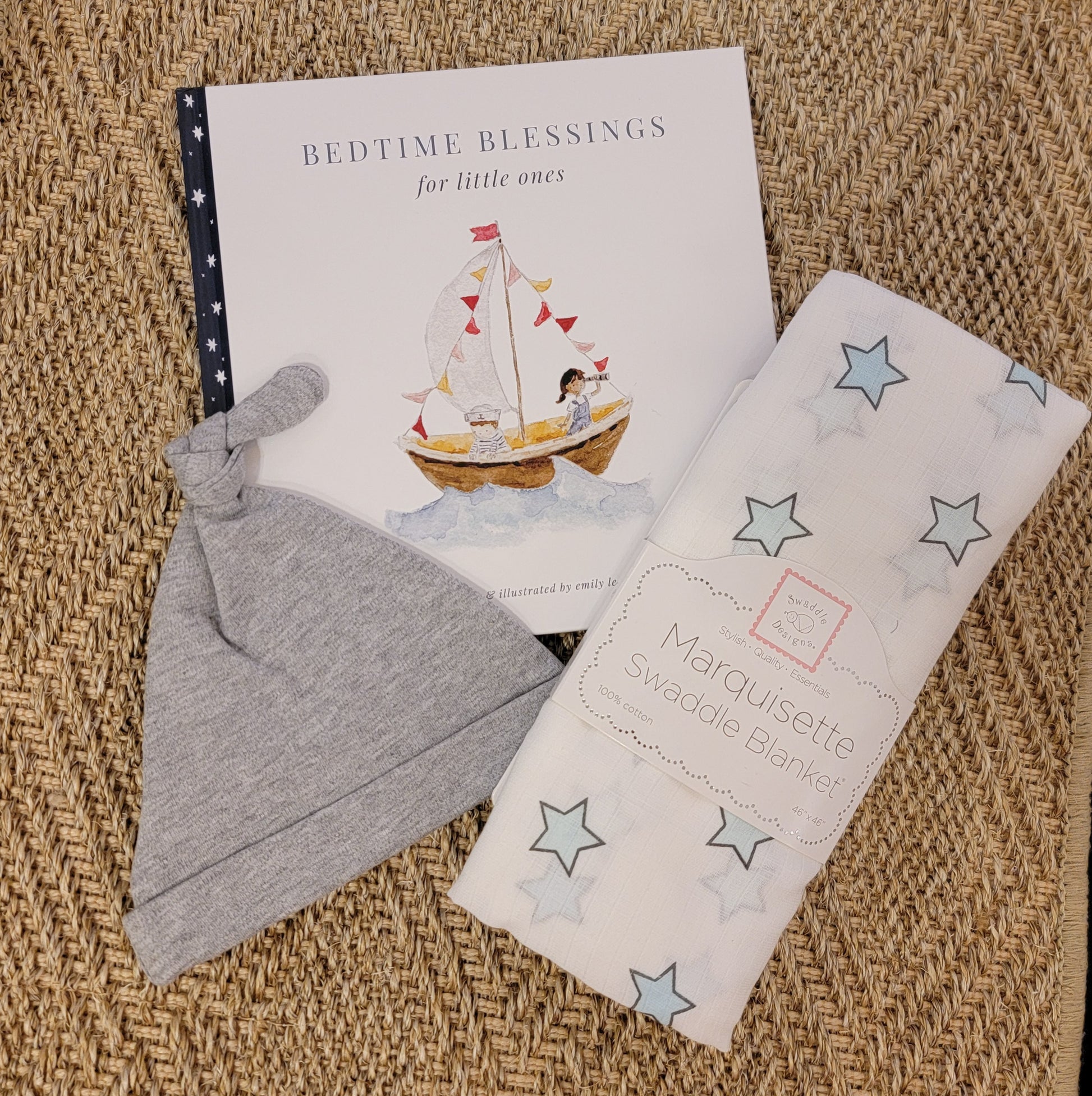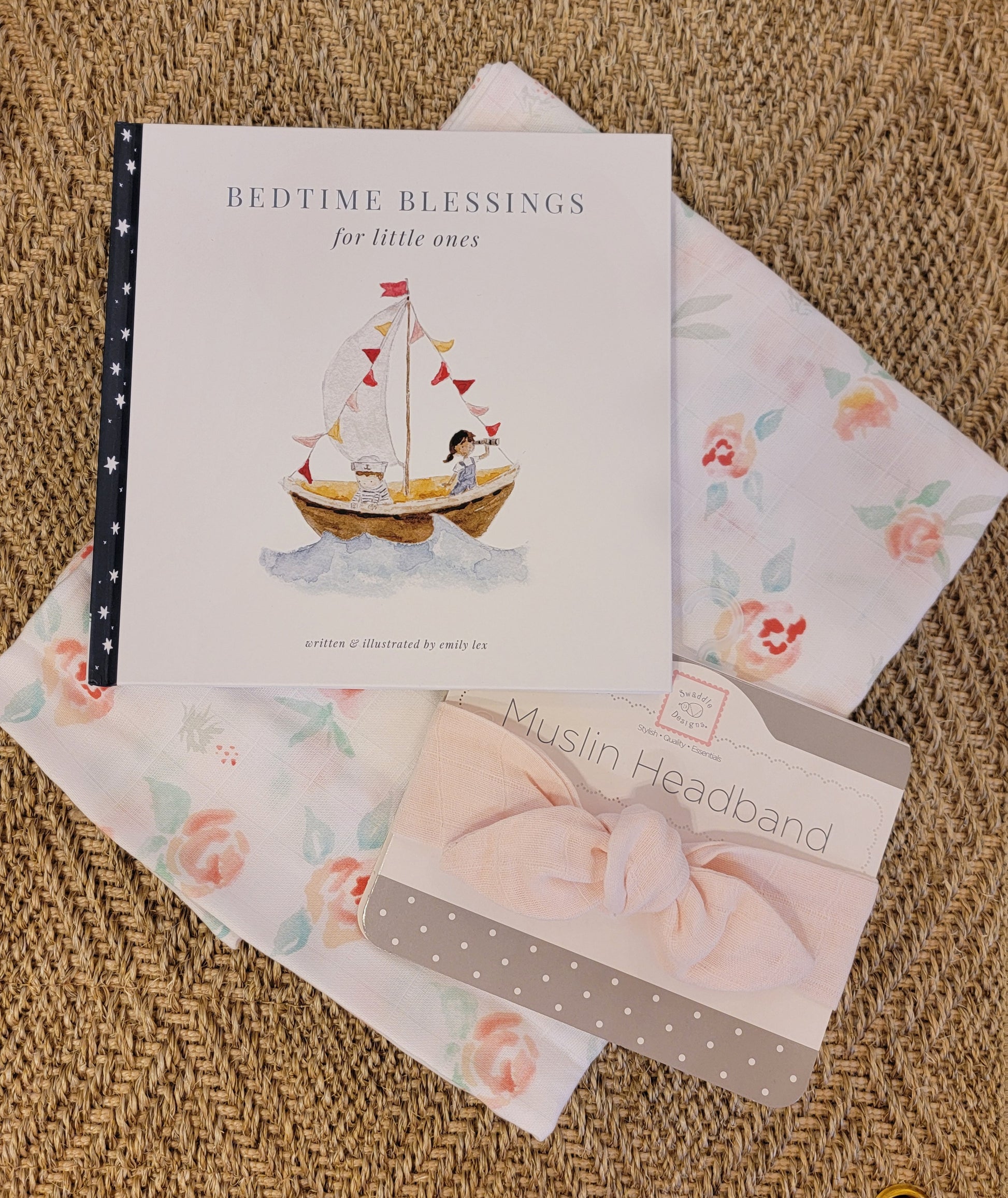 Welcome to the world! Send a little Schaefer House bundle of joy to the new family! This package includes a cozy 100% cotton muslin swaddle blanket perfect to snuggle with along with a coordinating headband or newborn hat. We've added a special book of Bedtime Blessings as a special way to end each day that will soon become a treasure for the whole house!