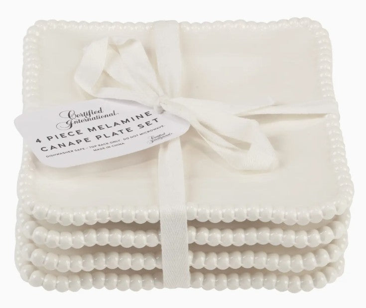 Elevate your dining experience with the Certified International Perlette Gift Cream Melamine Set of 4 Square Canape Plates. Crafted with exquisite attention to detail, these plates are not just ordinary dishes; they're a statement of elegance and sophistication. Their creamy hue effortlessly blends with any table setting, making them versatile for both casual brunches and upscale dinner parties. The distinctive beaded edge not only adds a touch of vintage charm but also catches the light, creating a shimmering spectacle on your table.